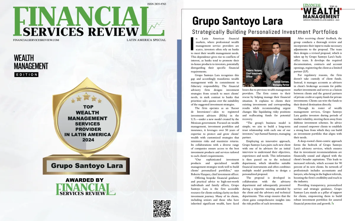 Nos complace compartir que Grupo Santoyo Lara ha sido destacado por la revista Financial Services Review como una de las 10 principales empresas en América Latina en servicios de gestión de patrimonios para el año 2024. Este prestigioso reconocimiento reafirma nuestro compromiso con la excelencia y la innovación en el manejo de inversiones.
